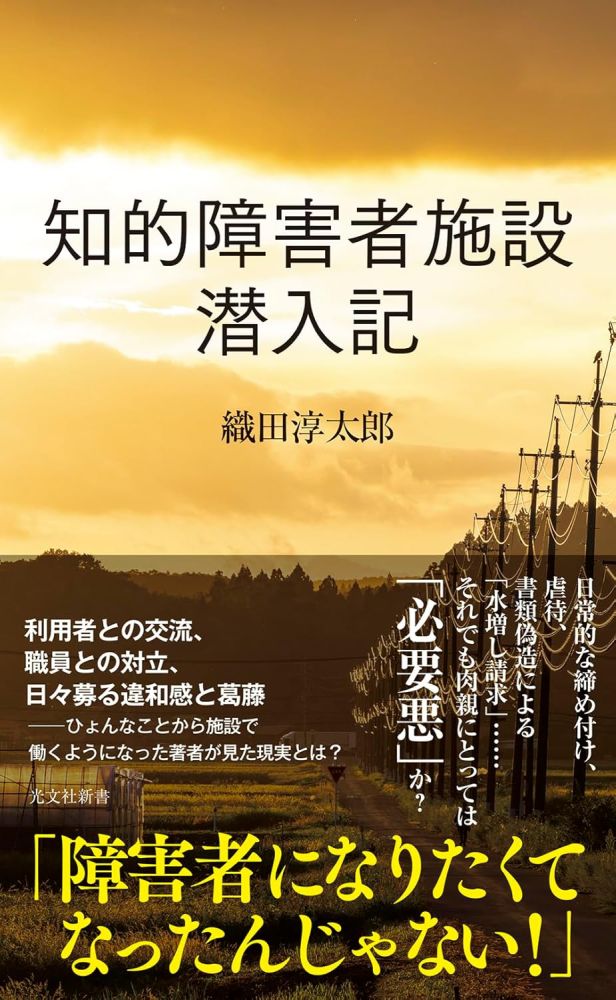 先日、織田淳太郎『知的障害者施設 潜入記』(2025)を読む機会を得ました。ジャーナリストである著者が、とある営利型法人が運営する生活介護事業所に運転手兼生活支援員として入職した2年間をルポルタージュしたものです。結論から言うとなかなかの良書で、管理職、職員、ヘルパーのみなさんにも役立つ内容と思いますのでお薦めしたいのですが、まずは私が読んで感想と気づいたことを述べたい思います。少しお付き合い下されば幸いです。